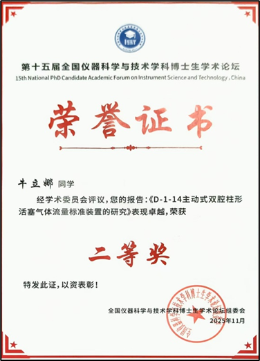 10月31日至11月2日,由国务院学位委员会仪器科学与技术学科评议组主办,西安理工大学、西安石油大学共同承办的第十五届全国仪器科学与技术学科博士生学术论坛在西安成功举办。本次论坛特邀国内外仪器领域知名专家、学者、工业界代表以及优秀中青年学者齐聚一堂,展开深入的学术交流。论坛秉持“交流、交叉、创新、合作”的宗旨,致力于为仪器科学与技术学科及相关学科的博士生搭建一个高起点、跨领域的学术交流平台,推动学科间的交叉融合,提升人才培养质量。论坛以博士生自主开展学术交流为核心,在专家与导师的悉心指导下,助力博士生拓宽学术视野、启迪创新思维、提升创新能力。论坛围绕精密测量技术及仪器、智能传感技术、智能感知与工程、视觉检测技术、现代检测与计量技术等多个主题展开深入研讨。我院方立德院长与李红莲副院长率领研究生王红宝、牛立娜、郭淑玲、高磊参加了此次论坛。其中,李红莲副院长受邀担任本次论坛的学术委员会委员。在论坛上,我院研究生牛立娜、高磊分别作了题为《主动式双腔柱形活塞气体流量标准装置的研究》和《基于热分布式传感器的环状流液膜厚度测量》的精彩报告。牛立娜同学凭借出色的汇报表现,荣获大会优秀汇报二等奖。此次论坛不仅充分展示了我院在仪器领域的最新研究成果,更进一步提升了我院在全国仪器科学与技术领域的学术影响力和知名度。