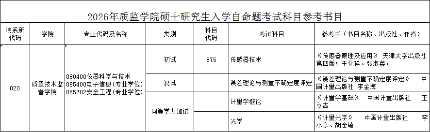 2026年质监学院硕士研究生入学自命题考试科目参考书目-仪器科学与技术、电子信息、安全工程